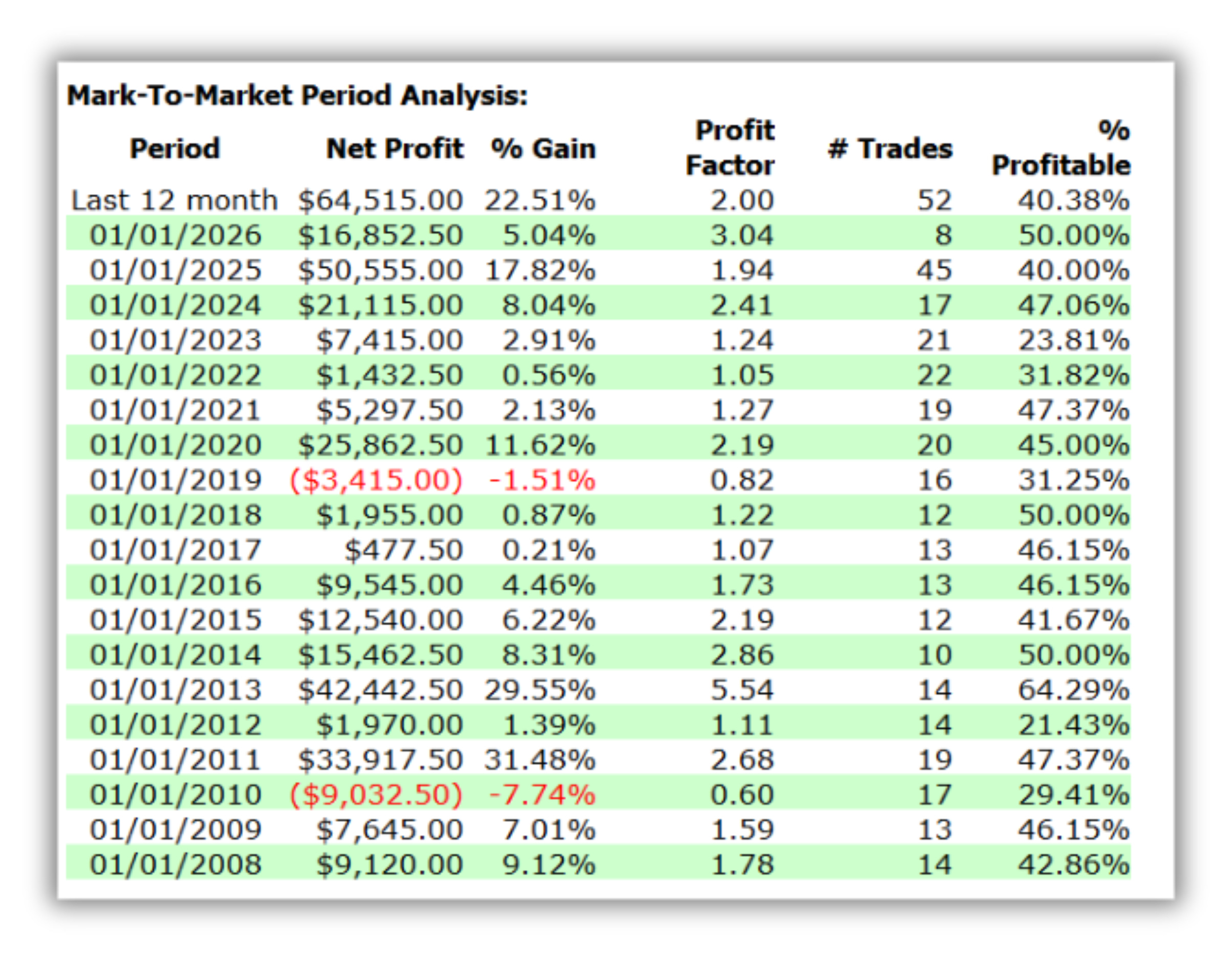 Only 2 losing years: 2010 and 2019.
